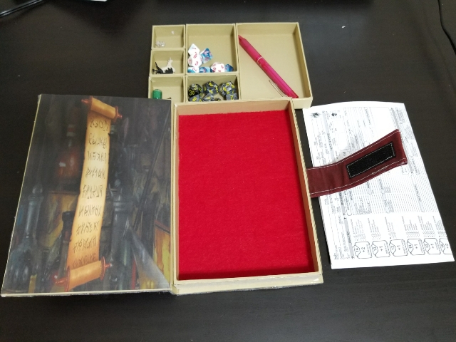 This a lightweight dice tray and organiser as you see outside is a synthetic leather bound with a velcro strap for closure, inside a removable organiser where you can store all your gaming needs and in the bottom a soft lining to roll your precious dices.