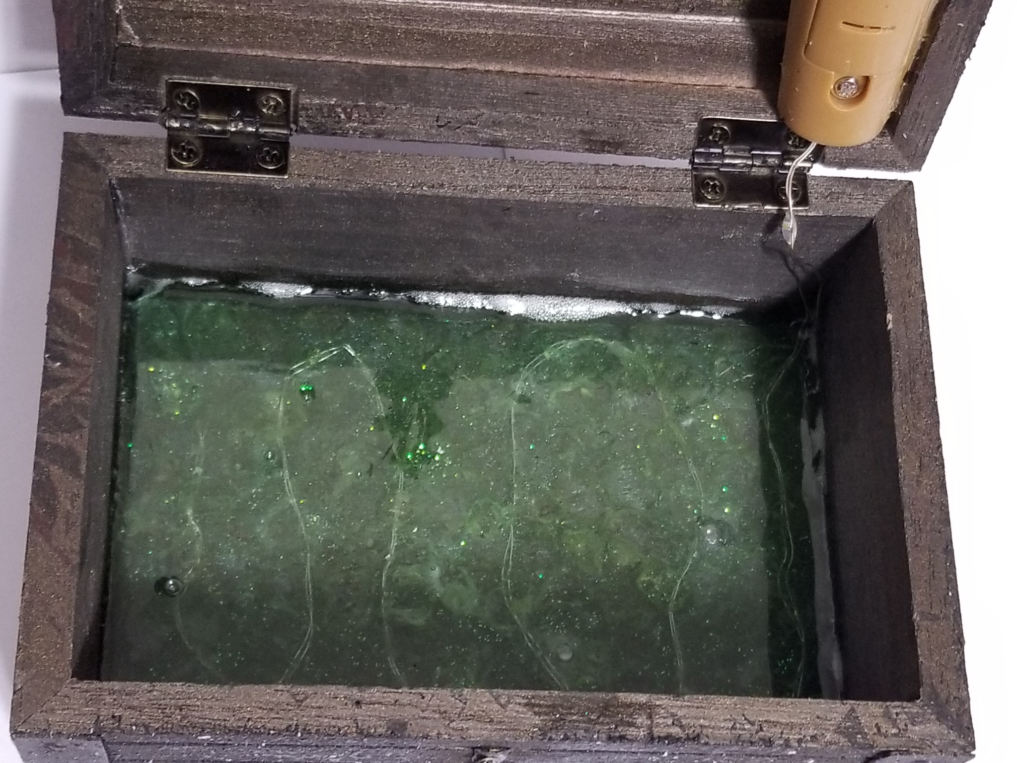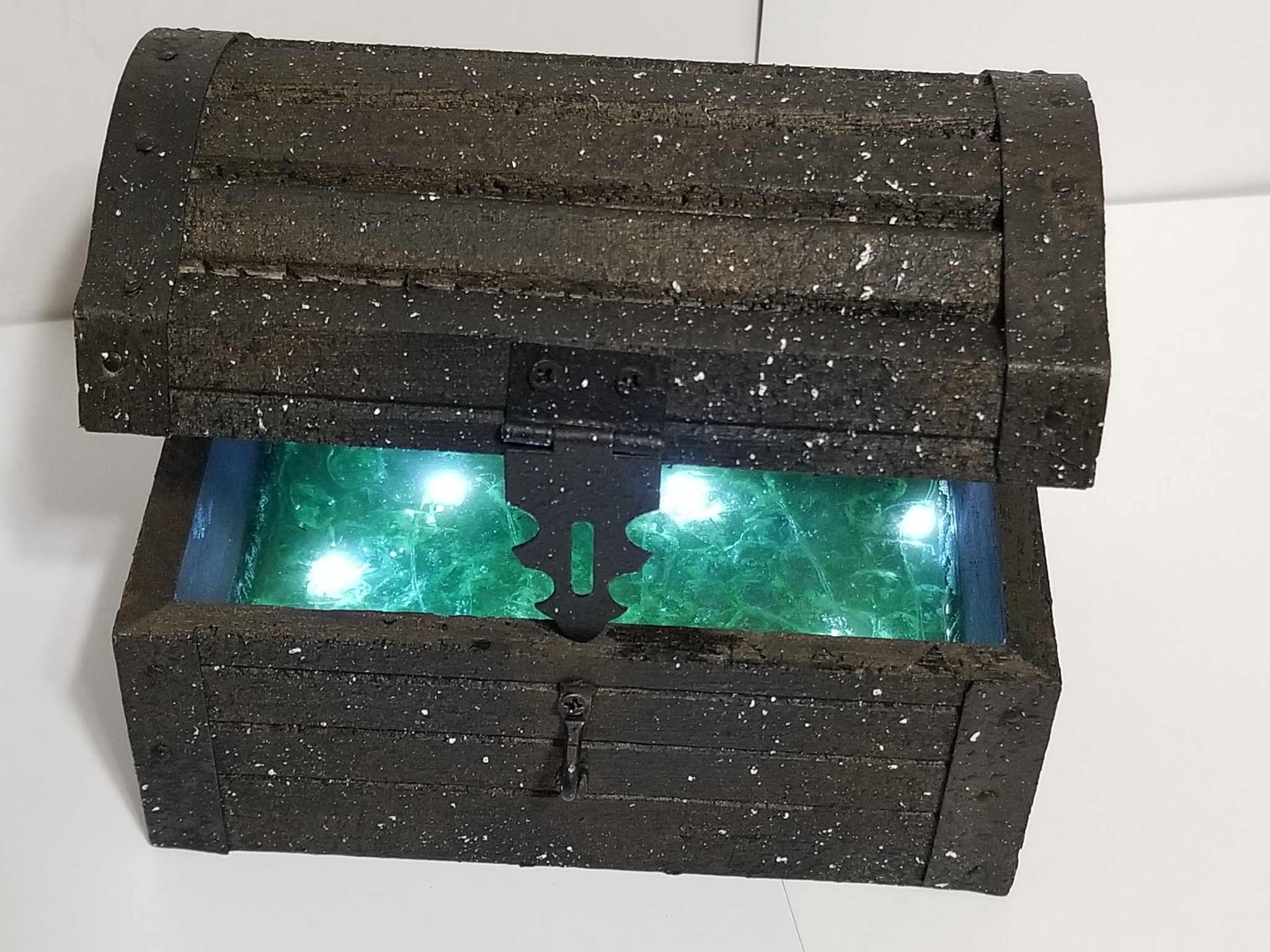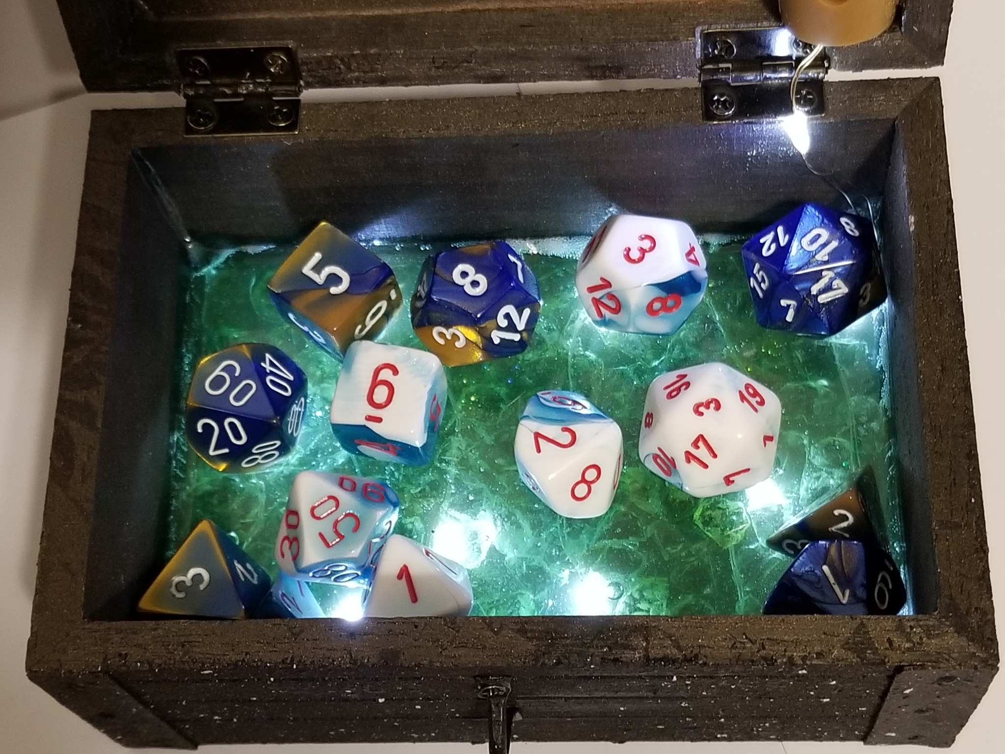 This mysterious Obsidian stone painted chest have an acid glow in the dark acrylic surface inside that lights up bringing a new twist to your tabletop needs. This chest holds up 5 maybe more dice set.