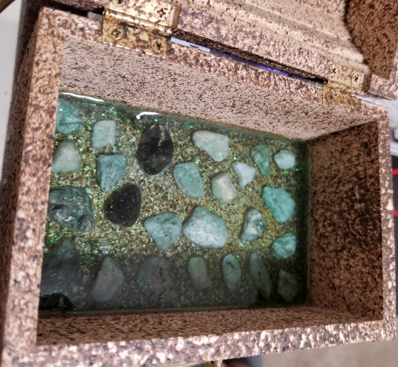 1.Fantastic Stone paint 2.Stones encased in a magical barrier in the middle of the tray 3. Holds uptm to 5 or maybe more dice sets